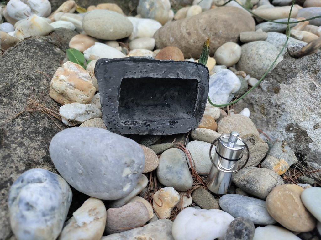 This deceptive little cache container looks like just another rock out on the trail but turn it over and you will discover a small watertight capsule hidden behind the back panel. Depending on your creativity and choice of location, these caches can be difficulty rated 1-5 in the wild.