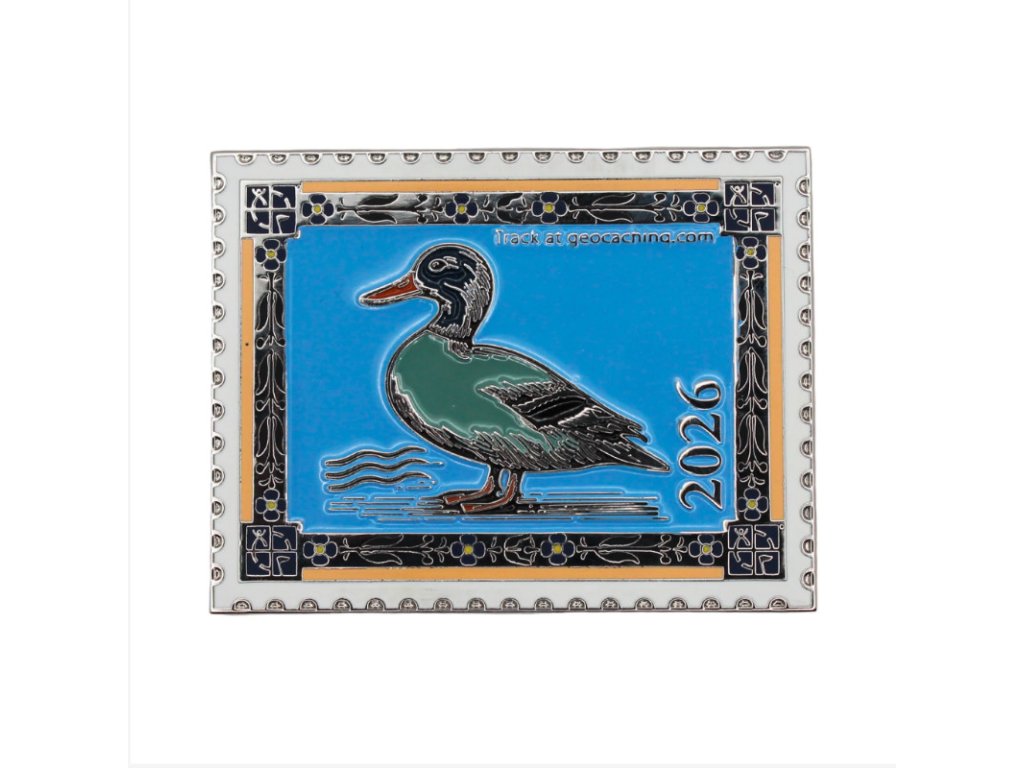 This geocoin has a fun and impressive design featuring a postage stamp theme. The spring design includes a fine duck on one side, and birds recharging on the other.