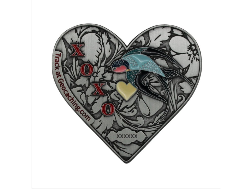 Spread the love with these heart shaped trackables! They are available in this lovely antique silver finish, and also in a limited edition antique bronze finish. Give them to someone to show your love, or send them out to spread that love throughout the geocaching world!