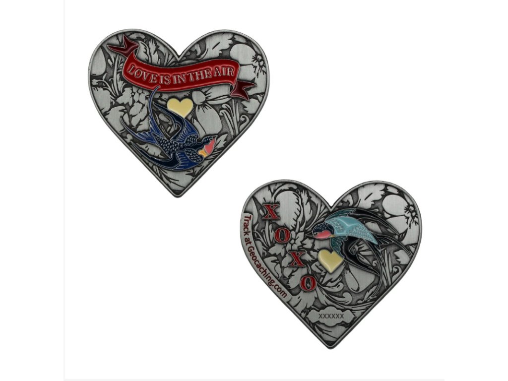 The Love is in the Air Geocoins are trackable at Geocaching.com with a unique icon.